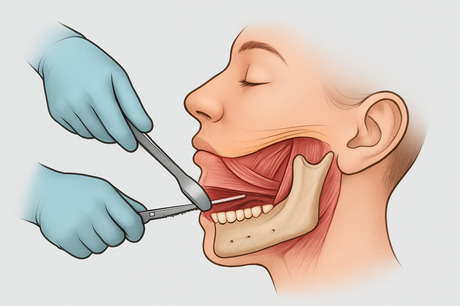 Exposição da Mandíbula: Os tecidos moles (pele, músculos, nervos e vasos sanguíneos) são cuidadosamente dissecados para expor a porção da mandíbula que precisa ser removida. Nervos importantes, como o nervo facial e o nervo alveolar inferior (responsável pela sensibilidade do lábio inferior e dos dentes inferiores), são identificados e preservados sempre que possível durante o procedimento.